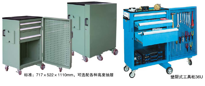 結合了工具車移動便捷、抽屜分隔、目測效果好、功能強的同時,又兼容了置物柜存放較大件工具的優點,特別適用于工廠機械維修工具存放特別的鎖結構保證了重要工具的管理。