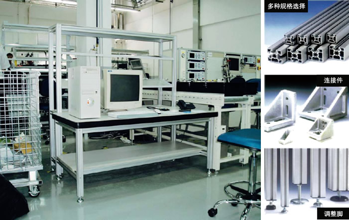 型材工作桌框架主要由各種規格型材組合而成,采用不同連接件連接,從而實現了不同的功能,比如可配文件看板、燈具、氣動工具、吊抽、吊柜等等。可自由搭配,結構簡單,充分體現了鋁型材作為柔性產品的優勢。