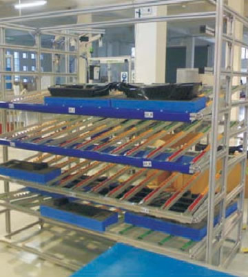 型材流利架主要采用40×40型材,配合鋁型材滾道設計制作美觀、實用。主要適用于工作輕型零配件加工行業流水線,不同顏色滾道體現了不同的儲料情況