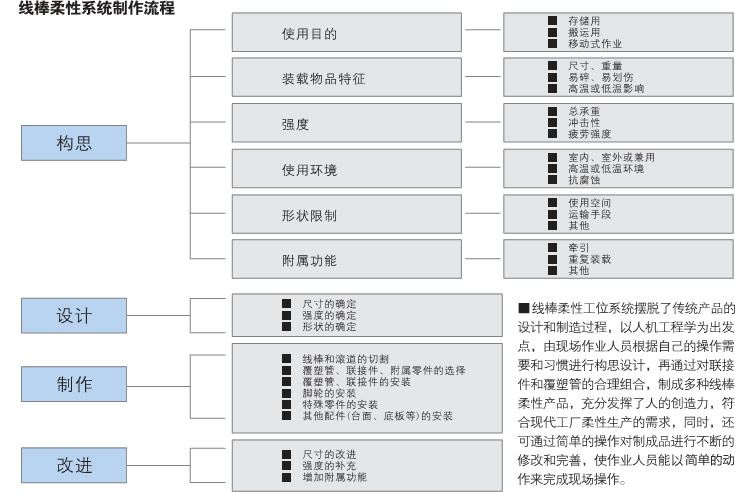 線棒產品是由管件和聯接件組成的一種模塊化系統,可以將任何創造性的想法轉換成一種個性化的切合實際的結構,迅速實現操作人員對工作環境的構思和創意。并且制造簡單、迅速、低成本。 有了線棒產品的管件和聯接件,只需要您的想象,您就可以搭建。它不單單只是容易,并且十分有趣。線棒產品任何人都可以設計和安裝、可以設計成任意尺寸,同時非常輕巧和易于搬運。