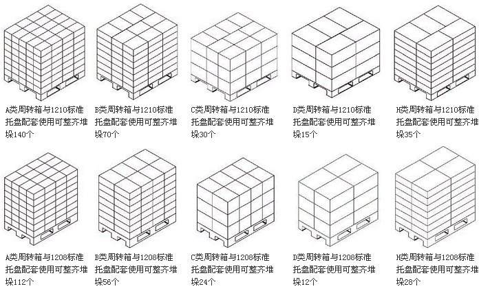可堆跺周轉箱與1210標準托盤、1208標準托盤的配用如下所示: